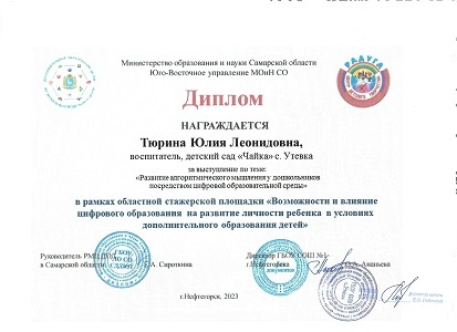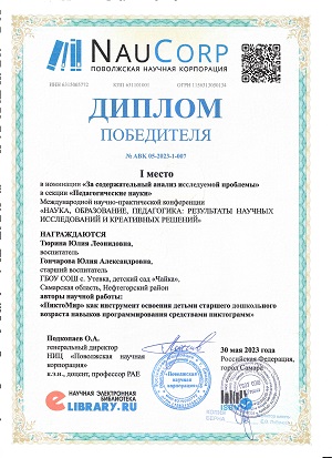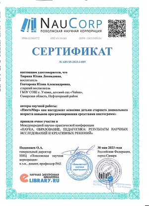 - "Работа по развитию алгоритмического мышления у дошкольников посредством цифровой образовательной среды «Пиктомир»; Научно-издательский центр «Поволжская научная корпорация» сборник статей международной научно-практической конференции НИЦ «Поволжская научная корпорация" Nau Corp