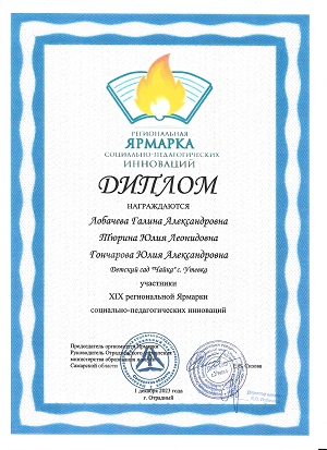 - Региональное робототехническое соревнование дошкольных образовательных организаций «ИКаРёнок» «Интеллектуальная собственность, изобретательство и ТРИЗ», сезон 2020-2021 год. Номинация «Опыт работы», 2020-2021, Сертификат за участие