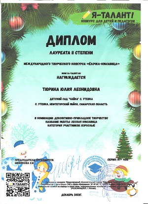 - Всероссийский творческий конкурс «Новогодние фантазии «Символ года» (поделка), 25.12.2020, Диплом Призера