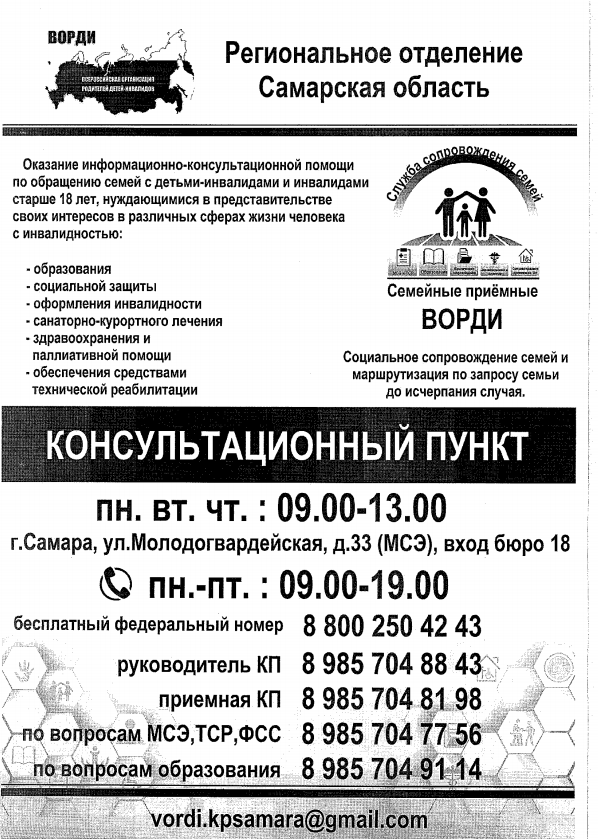 Уважаемые родители, информируем Вас о том, что с 1 сентября 2020 года на базе Регионального отделения «Всероссийской организации родителей детей-инвалидов и инвалидов старше 18 лет с ментальными и иными нарушениями, нуждающихся в представительстве своих интересов Самарской области» (далее - ВОРДИ) начал функционировать консультационный пункт службы сопровождения семей «Семейные приёмные ВОРДИ» (перейти на сайт >>здесь).