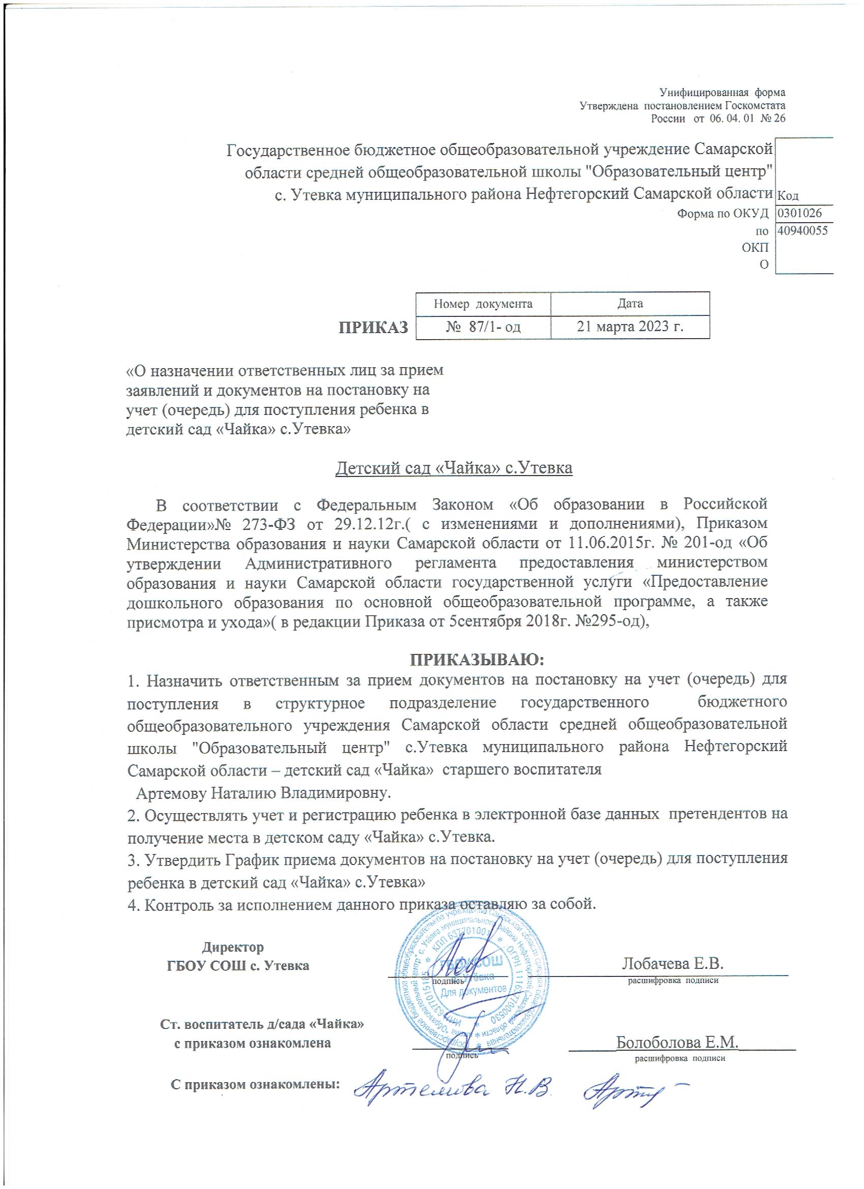 - Приказ о назначении ответственных за прием заявлений и документов для зачисления в детский сад "Чайка" с. Утевка